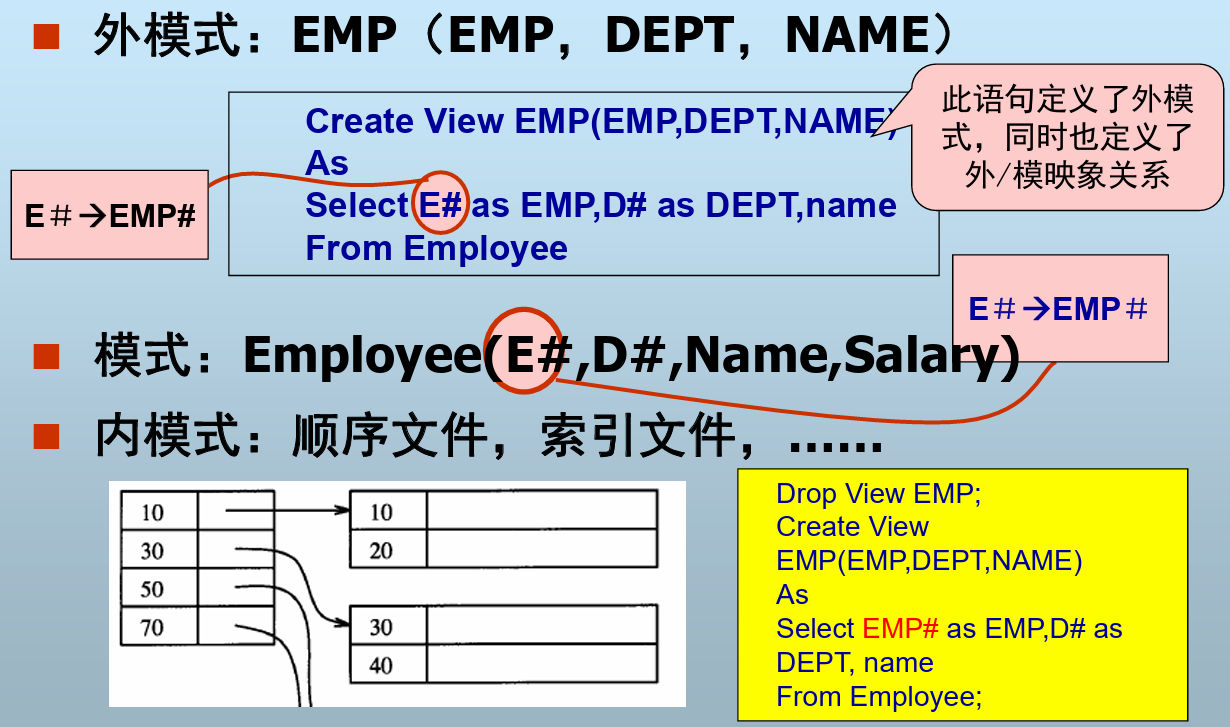 - 外模式中的属性可能由模式中的多个属性运算而 得