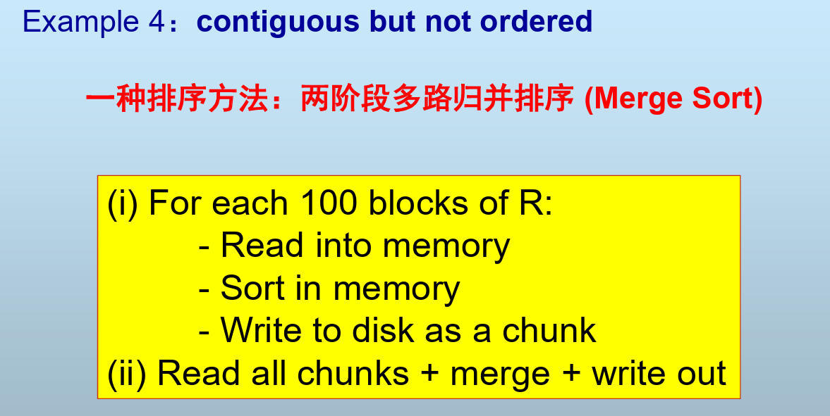 - 第一阶段:尽可能多的块读入内存中并排序成chunk,写回磁盘(图中一个chunk是100个块那么大)