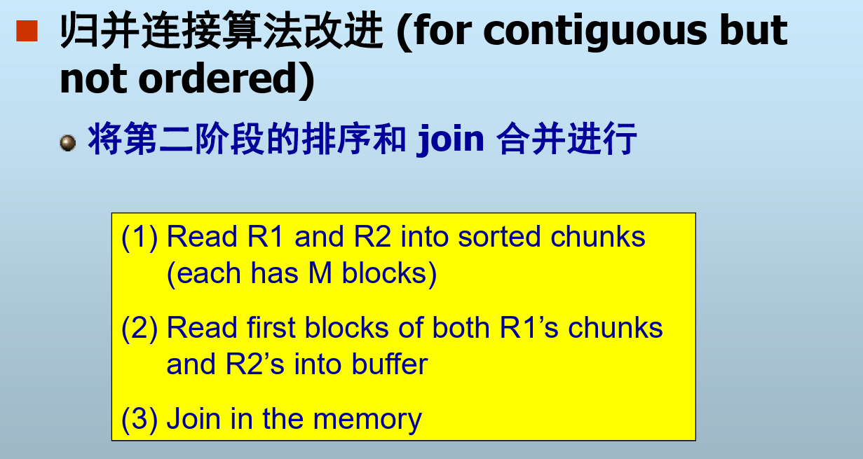 - 按外部归并排序将多个chunk归并,缓存中每次比较产生一个最小元组写回磁盘