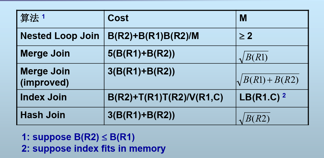 - 空间换时间,将R1元组尽可能读入内存中,R2元组每次进入内存可以与1000条R1的元组匹配,只需读入10次